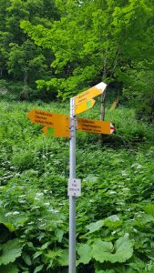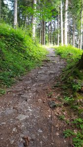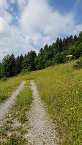 Crossing the road, we enter a meadow and follow a mixture of grass and gravel tracks as we slowly climb towards Kreuzegg, where we turn left and follow a grass track as it climbs towards the edge of the forest.