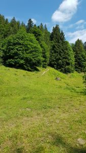 Entering the meadow, we turn left and follow a grass and dirt track as it leads across the meadow and into the forest.
