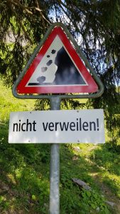 A warning sign gives us a timely reminder of the danger of rock falls on these exposed mountain tracks “Do not linger”. Followed a short distance later, by an example of such a rock fall.
