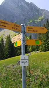 Eventually, the path turns to the right and starts to descend, before opening out into a meadow, which we cross and arrive at the signpost at Vorder Ahornen.