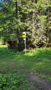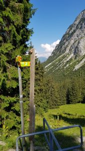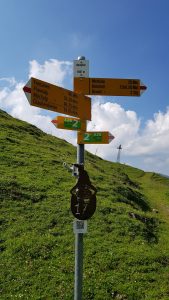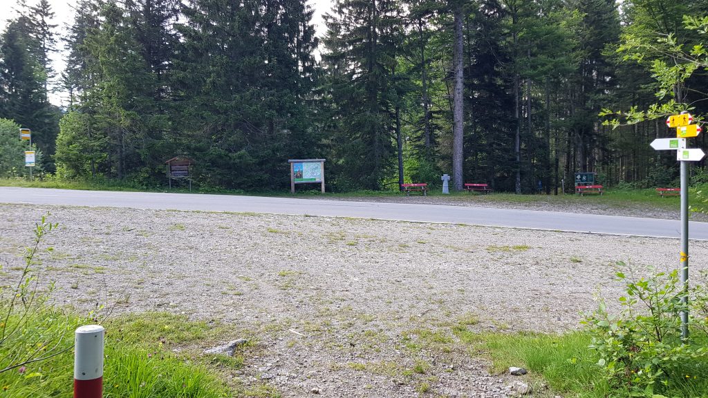 Turning left at the signpost, we now follow the same track that took us from the start of the hike this morning, back down through the trees, until we emerge from the trees at the edge of Panoramastrasse and the bus stop/car park at Mörlialp, which mark the end of the hike.