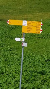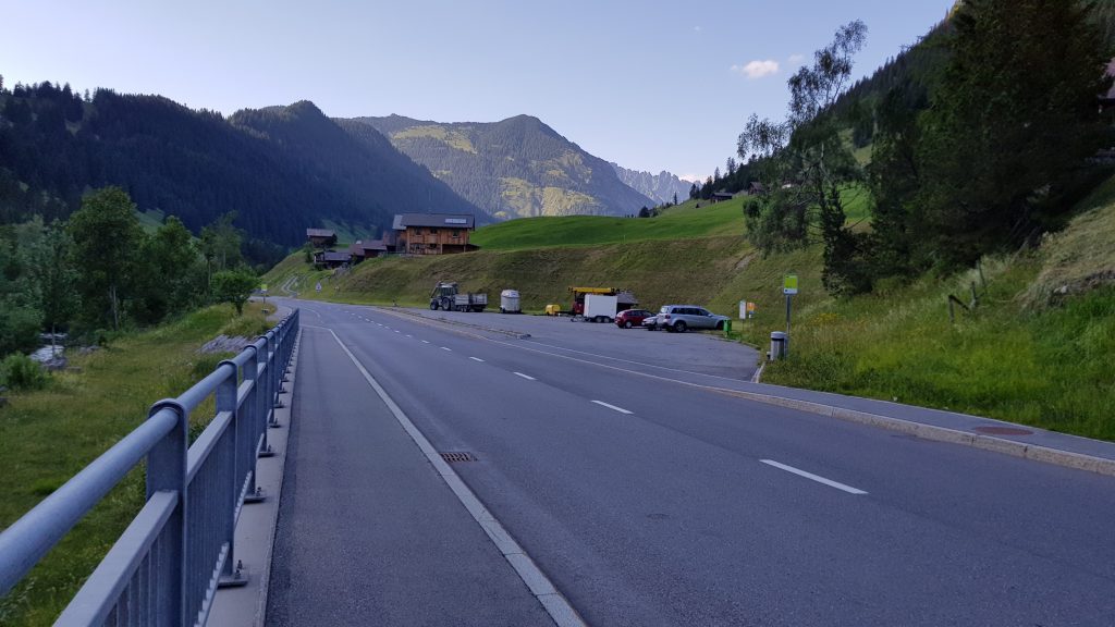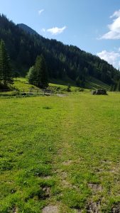 From the signpost at Alp Valüna, we continue a short distance on the gravel road as it passes the actual buildings, before we veer off to the left across the meadow towards a bridge that crosses the river.