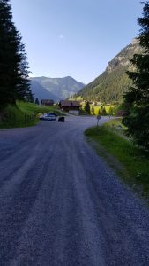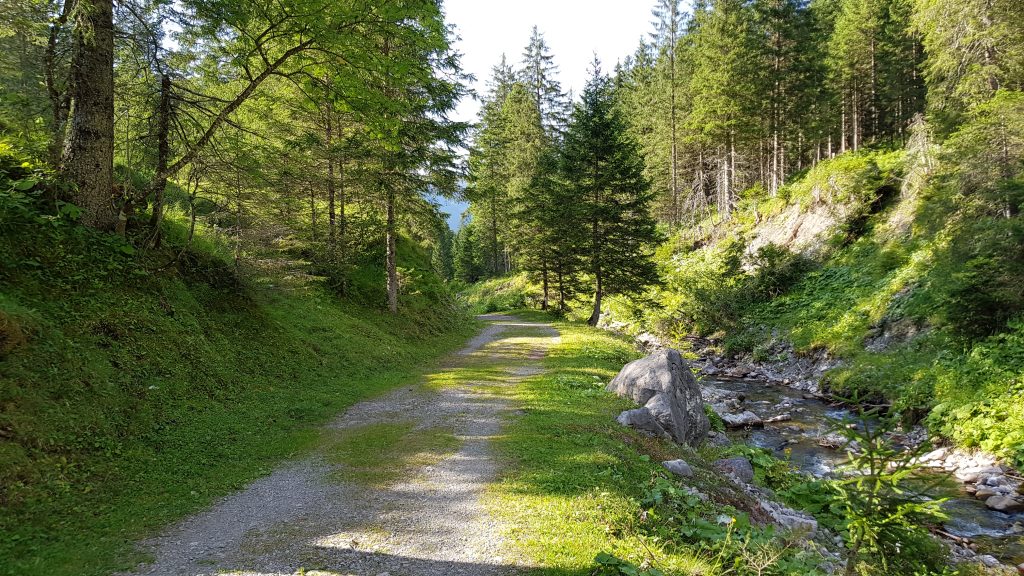 Eventually, we leave the meadows and join a dirt and stone track, still continuing along the side of the river, until we reach a bridge where the gravel road from Alp Valüna crosses the river and we join the road.