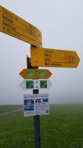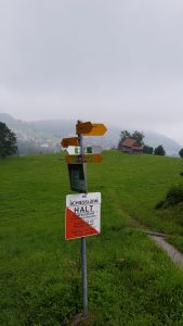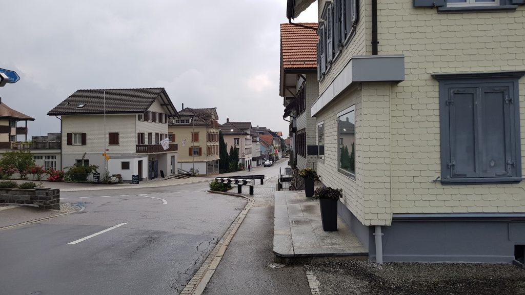 Turning right and walking a short distance, another gravel path leading to some steps can be seen to our right, which lead us up to another road and a short walk to the main road in Oberegg. A signpost directs to turn right, along the main road, which we eventually cross.