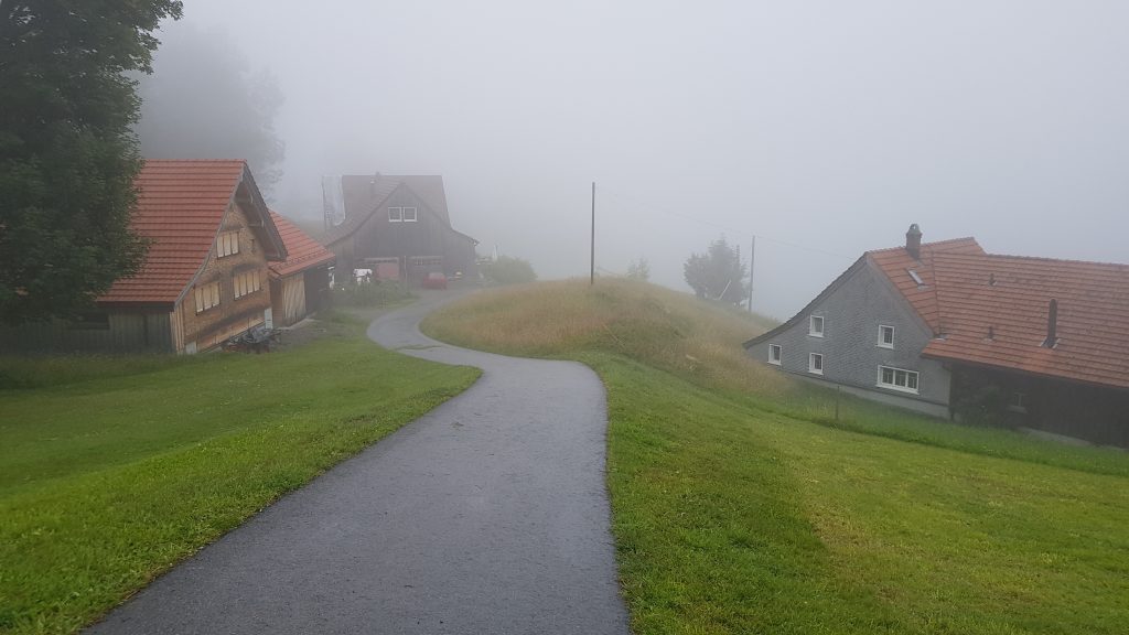 After descending the steps, we follow the broken hedgerow, until we arrive at another gravel track. The signpost here directs us to follow the gravel track, whcih after a while turns into a small tarmac road and we get our first view of the church in Oberegg in the distance. The tarmac road eventually arrives at a T-junction, and we are directed to the right, towards another set of houses.