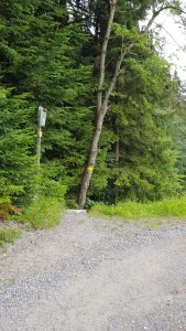 Just as the gravel track turns to the right and on towards a property, a trail marker directs us down some steps and onto a narrow gravel path. This path takes us around the edge of the garden area of the property and towards a gap in the trees that leads us into the wooded area.
