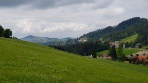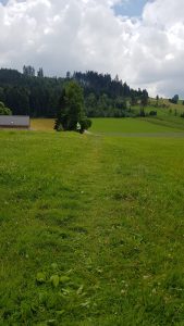 Skirting the edge of the wooded area, with views to our left to Heiden and Lake Constance beyond it, we start to gently climb, until we reach a meadow fenced off by electric fence with a gate in it.