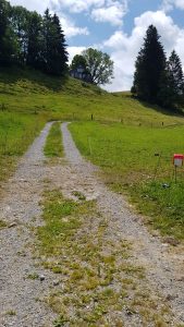 Turning right, at the signpost, we follow the track through the middle of the farm buildings and then, as it becomes gravel, around and steeply up to the building of Wirtschaft Rütegg.