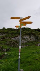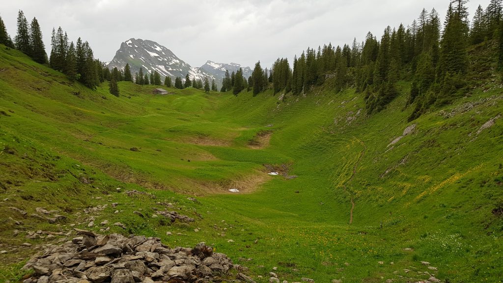 From the signpost at Äbenenmatt, we squeeze through the narrow path at the back of the farm buildings and take a grass and dirt track that leads us gently upwards. At the top of the ascent, the landscape opens up into meadows, with trees and bushes dotted around.