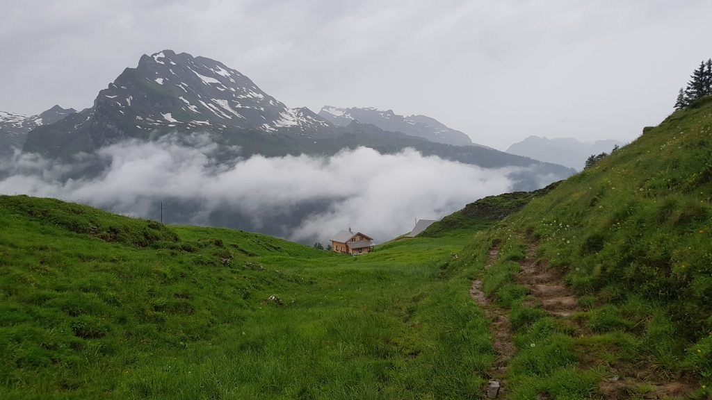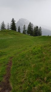 The path is pretty much just mud and grass here (mainly mud with the rain at the time), and carries on through small dips, in a generally downwards direction, until eventually, the farm buildings at Ober Saum come into view. We continue on down the grass and mud track until we reach the buildings.