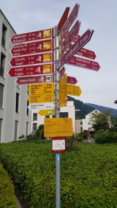 Exiting the station, you can see the signpost indicating the start of the hike across the road in front of you. There are a multitude of hiking and cycling signs, but the one you want is the one pointing towards Bad Pfäfers.