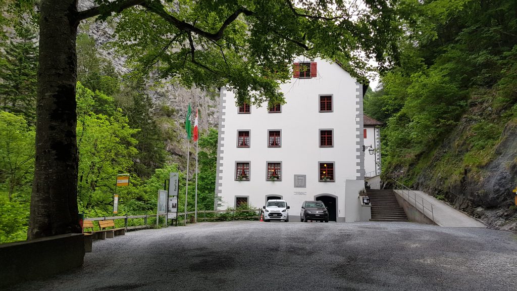 After about 45 minutes of walking along the road through the gorge, the end of the road and the buildings of Altes Bad Pfäfers appear before us, marking the end of this first section of the hike.