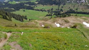 Eventually, we arrive at the more open Alpine moors and follow the sometimes hard to spot trail markers down towards the pastures and arrive back at the signpost marking where the circular part of the hike ends and the path back through the forests and over the final pastures towards the berghotel and gondola station.